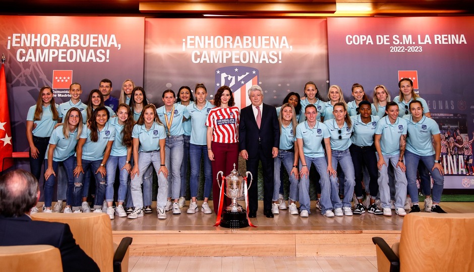 La primera parada de los homenajes fue en la Real Casa de Correos, donde la presidenta de la Comunidad de Madrid, Isabel Díaz Ayuso, entregó una placa conmemorativa a Enrique Cerezo, mientras que nuestro presidente y nuestra capitana Lola Gallardo entregaban una camiseta rojiblanca a la presidenta de la Comunidad. Lola Gallardo se mostró muy contenta y feliz de poder ser recibidas en la Comunidad de Madrid: "Gracias a todo el cuerpo técnico, a nuestra afición, a nuestros patrocionadores y a todo el equipo por el esfuerzo hecho durante toda la temporada". A continuación, nuestro presidente Enrique Cerezo apuntaba: "Estamos encantados de estar aquí una vez más. Habéis hecho una magnífica temporada que se ha rematado con un partido que a la gente le gusta ver". Por último, Isabel Díaz Ayuso daba la enhorabuena a nuestro equipo "el Atleti es un equipo bravo y fuerte como es nuestra Comunidad. El Atlético de Madrid es parte responsable de que se perciba por todo el mundo la imagen de Madrid. Por este palmarés y este compromiso la Comunidad de Madrid siempre estará en deuda con vosotros". Para finalizar, nuestras jugadoras salieron al balcón de la Comunidad de Madrid para mostrar a los atléticos que estaban en la Plaza de Sol el título copero.